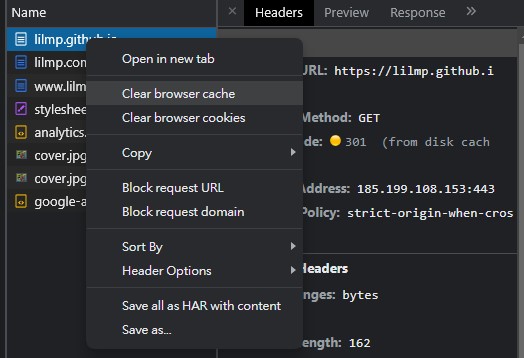 針對不希望轉址網域(ex: lilmp.github.io)點右鍵,執行clear browser cache,如此便會真正刪除原本的快取,重新整理後就不會再鬼打牆自動轉址囉!